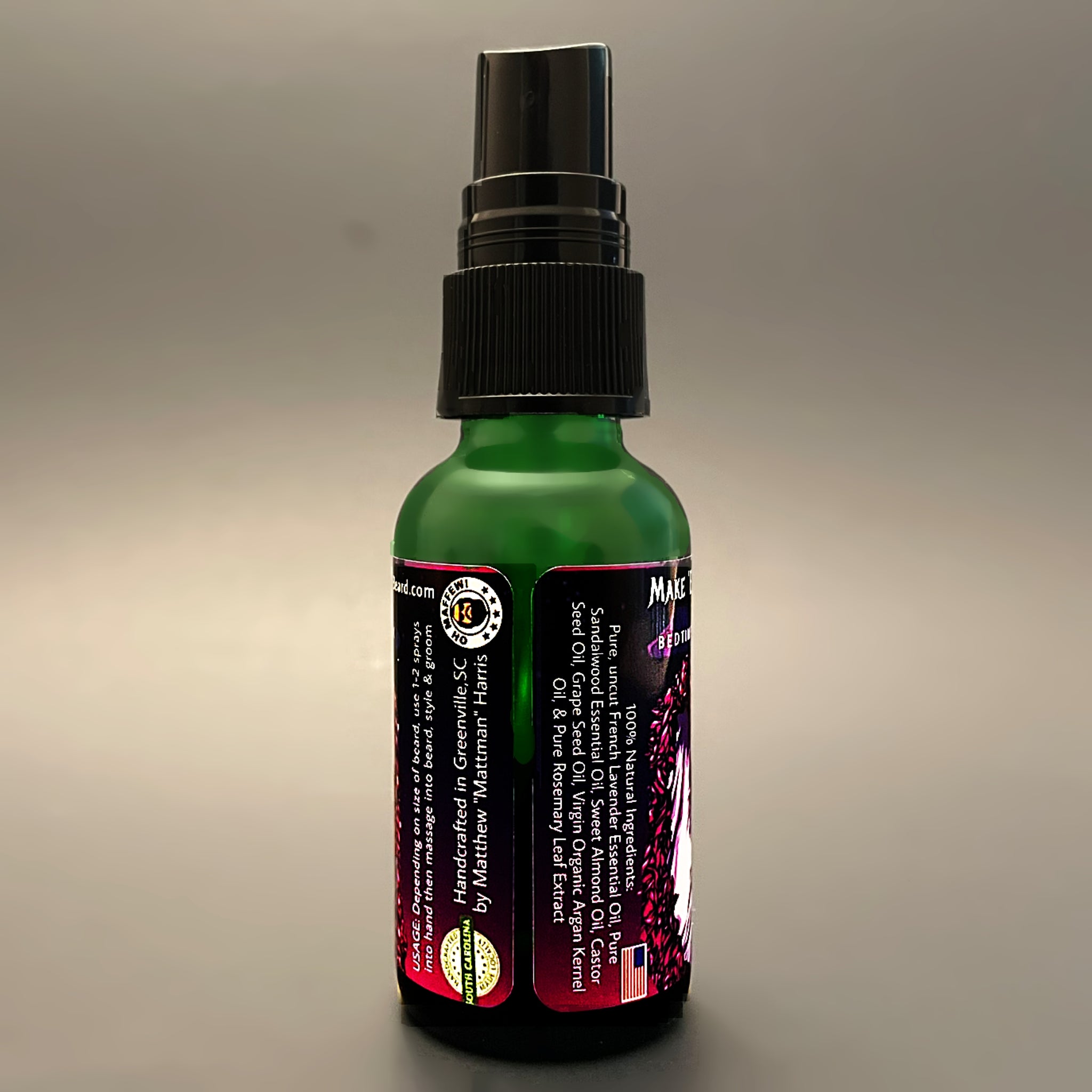 INGREDIENTS: Pure, uncut French Lavender Essential Oil, 100% natural and pure Sandalwood Essential Oil, high-grade and uncut Sweet Almond oil, 100% natural Castor Seed essential oil, the absolute best Grape Seed essential oil, 100% Virgin Organic Argan Kernel oil, 100% phthalate-free fragrance, and the absolute best Rosemary Leaf Extract essential oil.