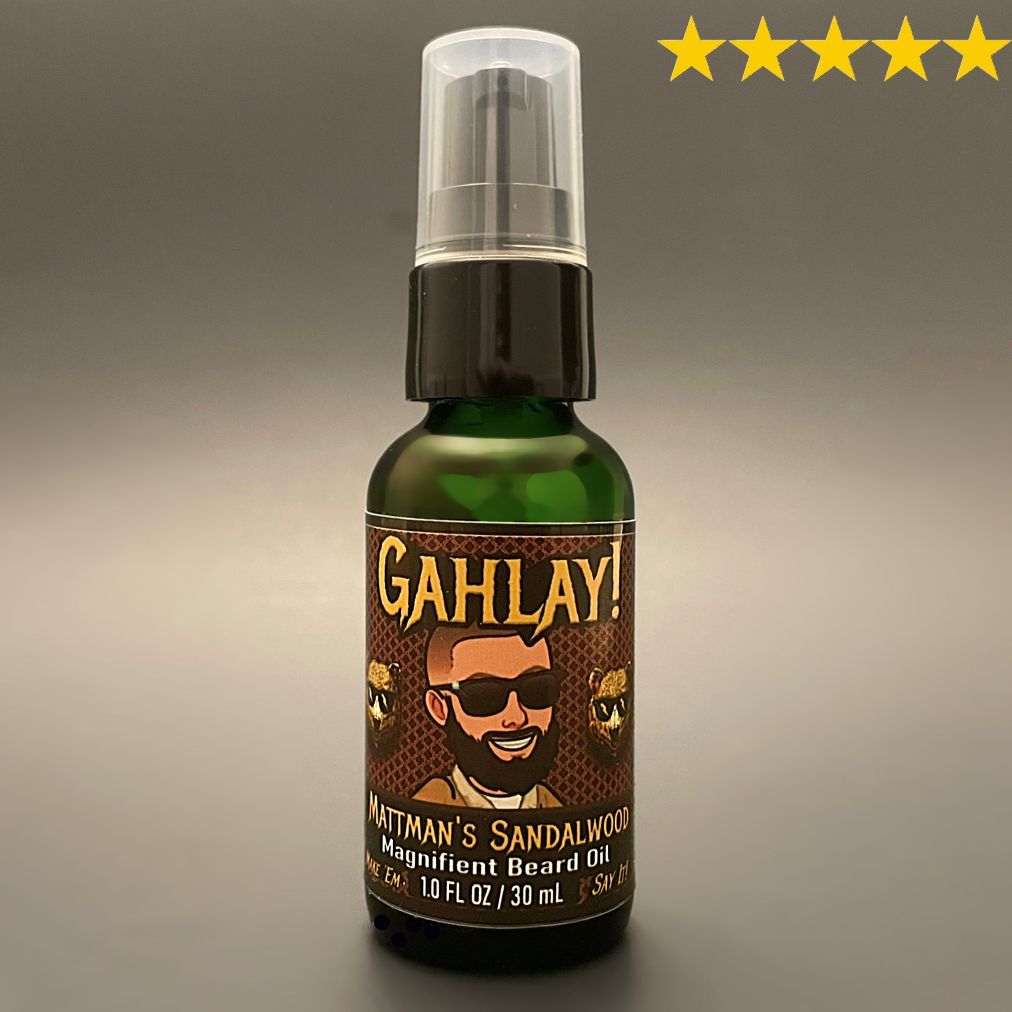 MATTMAN's OG Sandalwood Beard Oil - Discover the roots of GAHLAY! Beard Co. – where it all began! Originally crafted by Mattman of "'The Rise Guys" Show for personal use, this signature blend became a sensation among friends and beyond. Now, everyone can experience the magic of 'Make 'Em Say It!' with this aromatic masterpiece. MATTMAN's OG SANDALWOOD is a symphony of nature's finest essences. From the sweet hint of Fractionated Coconut Oil to the warm embrace of Golden Jojoba, the nutty depth of Hemp Seed, the sharpness of Tea Tree, the citrus radiance of Orange Bitter, the cool zing of Peppermint Supreme, to the woody echo of Sandalwood – this blend creates a sensory journey of sweetness, freshness, and earthiness. Immerse yourself in a natural realm of delights with every drop. Make sure to check out GAHLAY! Beard Balms also! They help you to style, shape, & nourish your beard as well as also adding volume! You'll "Make 'Em Say It!" in no time!