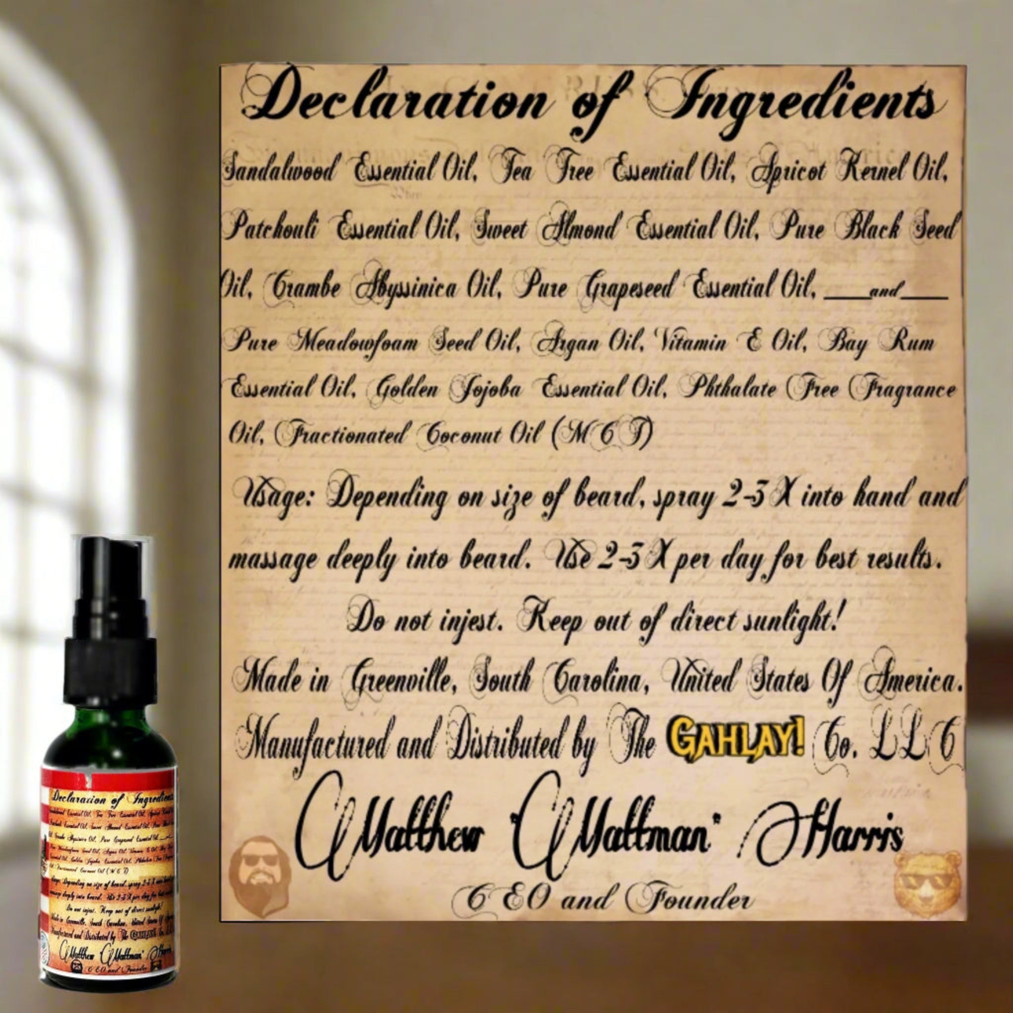 INSTRUCTIONS: Depending on the size of your beard, we recommend starting with 2-3 sprays into the palm of your hand & into your fingers. Then work into damp beard from top to bottom. Repeat as needed or to add more volume depending on size of beard. DO NOT DIGEST! We highly recommend styling & grooming the finished product with GAHLAY! Beard Balms! While we always strive to use as many gentle and naturally derived ingredients as we can, different people can react differently to certain ingredients. If any skin irritation occurs, be sure to discontinue use and consult with a medical professional. Always refer to the product packaging for the most accurate ingredient listing, and consider doing a spot test on your wrist if you have any concerns.